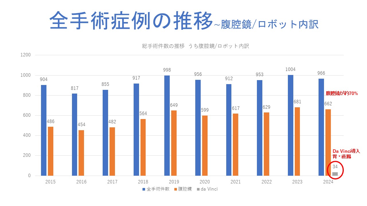 当科は、消化器悪性腫瘍、いわゆる消化器がんに対する外科治療を中心としています。また、急性胆嚢炎、虫垂炎等の腹部救急疾患に対する手術も積極的に行っています。手術は腹腔鏡あるいはロボット(Da VinciX)を用いた低侵襲手術が第一選択です。しかし、低侵襲手術にこだわることはせず、それぞれの患者さんの症状にあわせて、開腹手術など最も最適と考えられる手術を提案いたします。