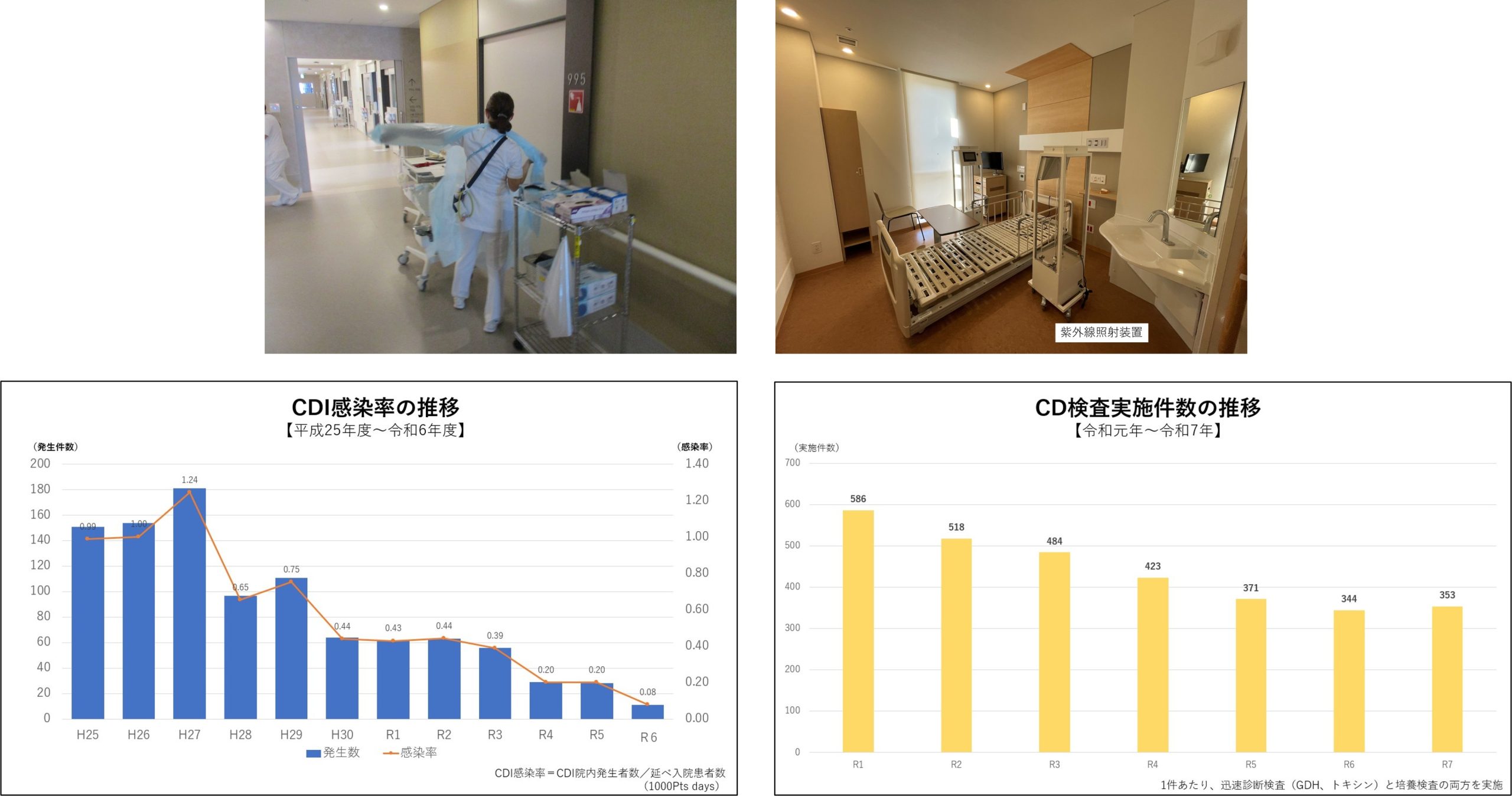 我が国におけるClostridioides difficile関連腸炎は、明らかでない部分も多いのが現状です。抗菌薬を使用する中で下痢症をきたす場合が多くみられるため、当院では下痢症状出現時には積極的に検体を提出することを強く推奨しており、標準予防策および接触予防策の遵守に力を入れています。また、感染症患者の退室後は紫外線照射装置を用いて、環境表面の消毒作業を行っています。