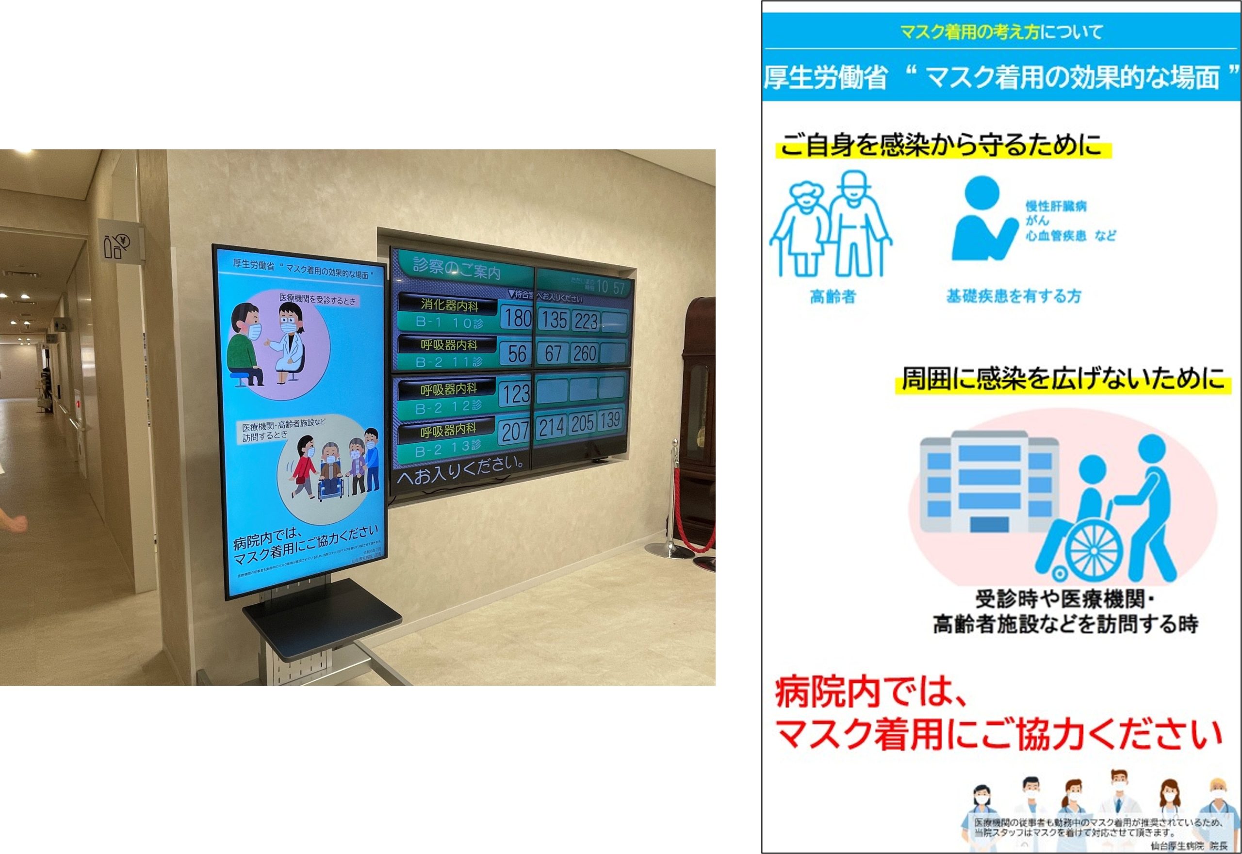 そのため、患者さんや来院者に向けての情報提供として感染対策についての院内放送やポスターの掲示を行っております。